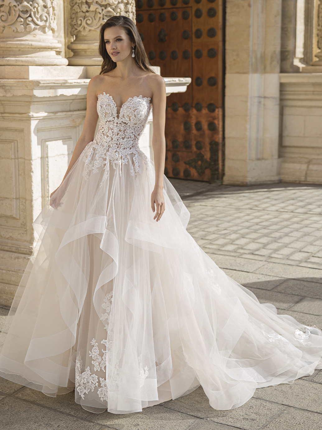 Du suchst ein romantisches Brautkleid, das sofort eine klare Taille zeigt und trotzdem leicht wirkt. Der trägerlose Herz-Ausschnitt setzt dein Dekolleté sauber in Szene, ohne zu viel zu zeigen. Am Oberteil fallen die Spitzenapplikationen direkt auf, die bis in den Rock hinein auslaufen. In ivory wirkt das Gesamtbild weich und klassisch, ohne kühl zu sein.