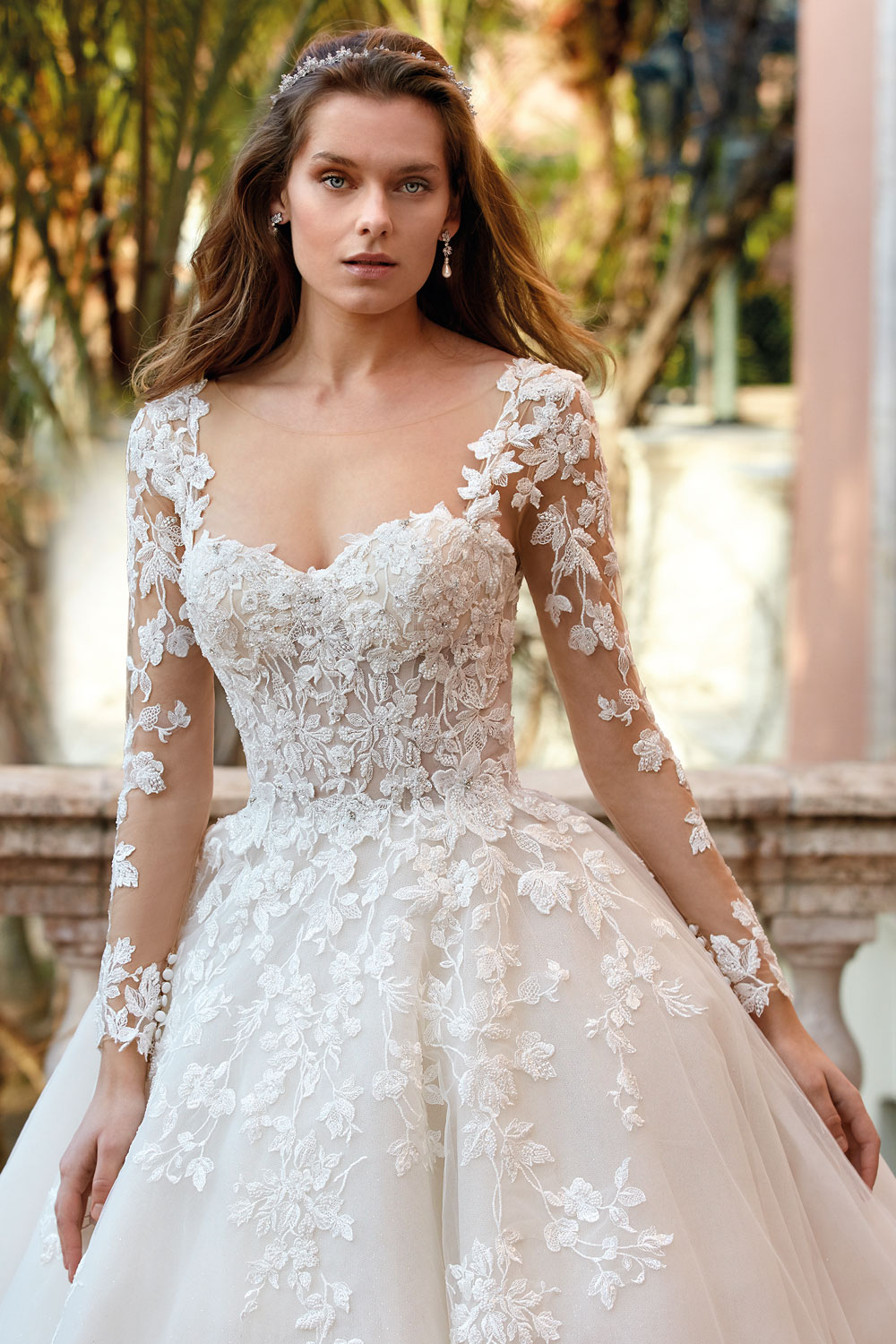 Das Demetrios Brautkleid besticht durch romantische Spitzenapplikationen und einen tiefen Rücken. Der Herz-Ausschnitt und die langen Ärmel verleihen dem Kleid eine zeitlose Eleganz. Perfekt für die Braut, die von einem märchenhaften Auftritt träumt.